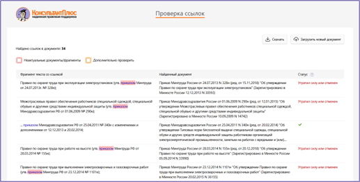 После загрузки вашего документа система распознает и проставит гиперссылки на упоминаемые правовые и технические акты, даст краткий отчет о статусе правовых актов – действуют они или нет.