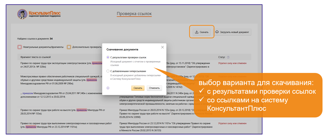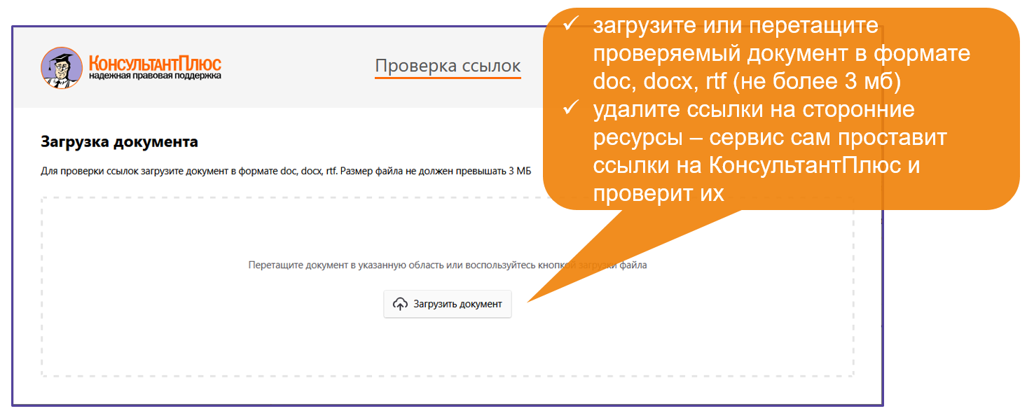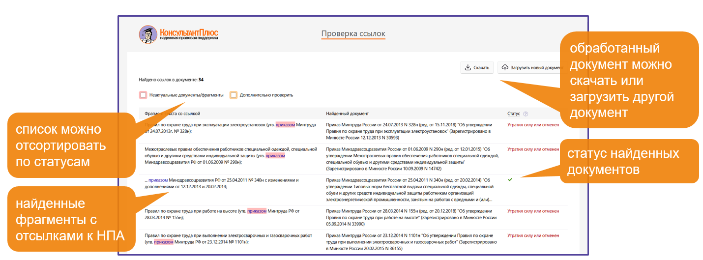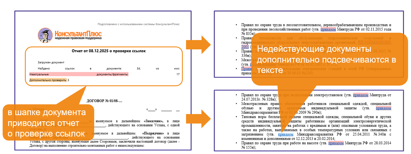После загрузки вашего документа система распознает и проставит гиперссылки на упоминаемые правовые и технические акты, даст краткий отчет о статусе правовых актов – действуют они или нет.